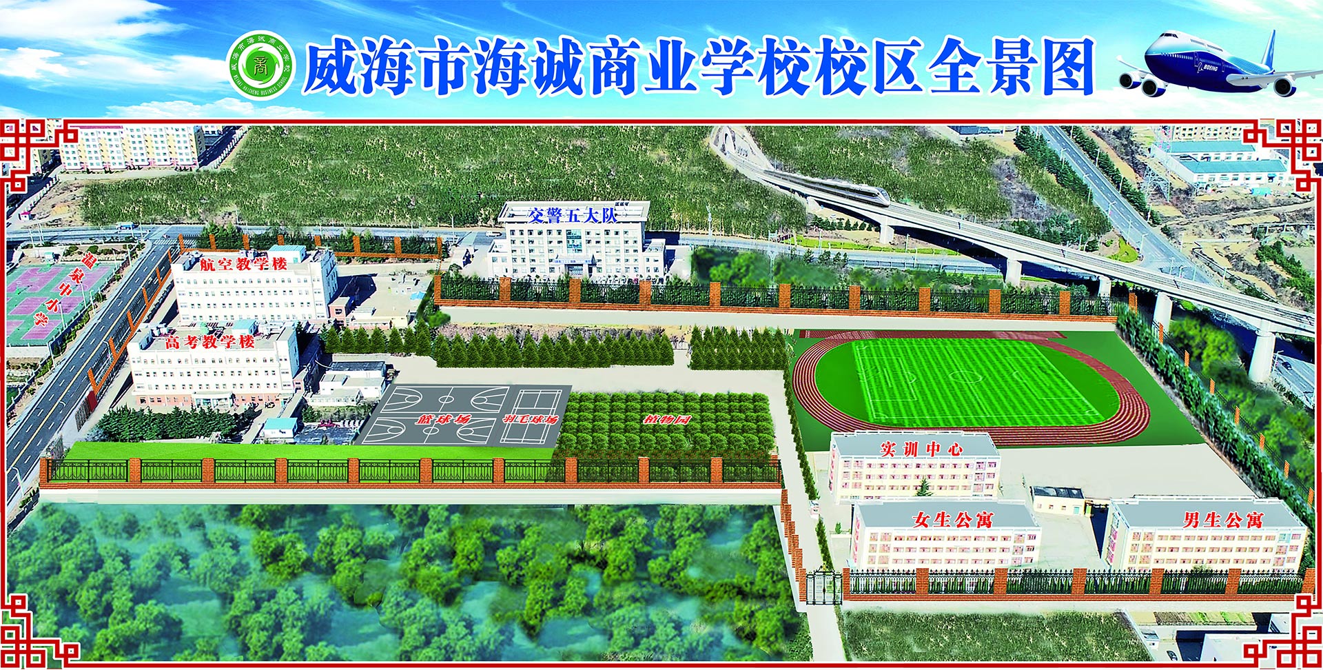 威海市海诚商业学校(原威海市商业学校)始建于1980年,经威海市教育局批准成立,由环翠区教育和体育局主管的民办非营利性中等职业学校。学校现有在校生千余人,专兼职教职工95人。学校位于环翠区温泉镇温泉路,比邻温泉学校,校园占地70多亩,建筑面积30000余平,环境优美、配套完善。学校建有教学楼、实训楼、宿舍楼等,建设了航空实训、综合实训(含无人机)、国防技能训练、国防拓展训练、休闲动植物养护与经5大实训基地,设置了计算机实训室、形体训练厅、化妆室、茶艺室、心理咨询室、非遗手工品工作室等10余个功能教室和2个市级中小学职业体验中心。在环翠区教育和体育局的指导下,学校与环翠区体校、明湖路学校、温泉学校共建了橄榄球训练基地和田径项目训练基地。